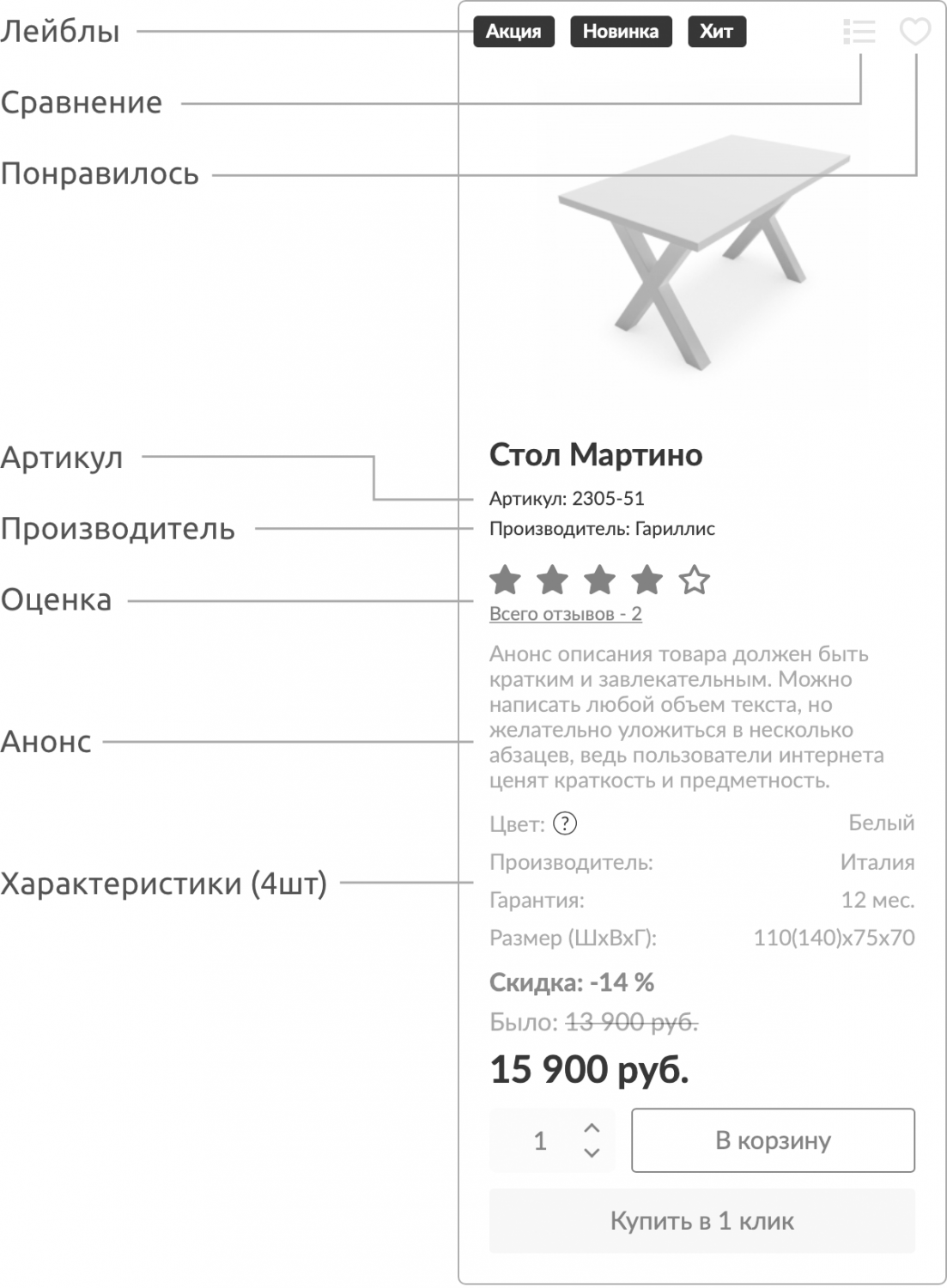 Для изменения вывода информации в блоке товара в каталоге шаблона, в настройках шаблона перейдите во вкладку "Карточка товара в листинге" и измените соотвествующие значения