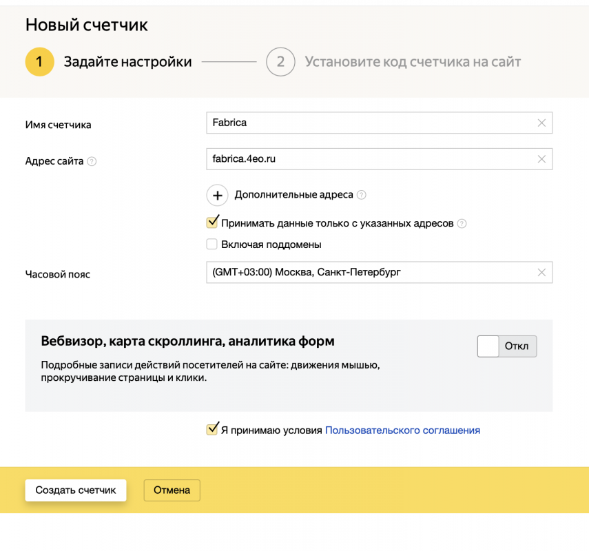 - В имя счетчика можно указать любое название, оно будет отображаться в списке всех ваших счетчиков. Адрес сайта -- вставьте сюда адрес вашего сайта, в нашем случае это https://fabrica.4eo.ru. Принимать данные указанных адресов -- можно поставить, на свое усмотрение, подробнее о функции можно узнать по наведению на значок вопроса. Часовой пояс ставьте тот, в котором находитесь. Вебвизор, карта скроллинга, аналитика форм -- также по желанию. Затем нажмите "Создать счетчик"