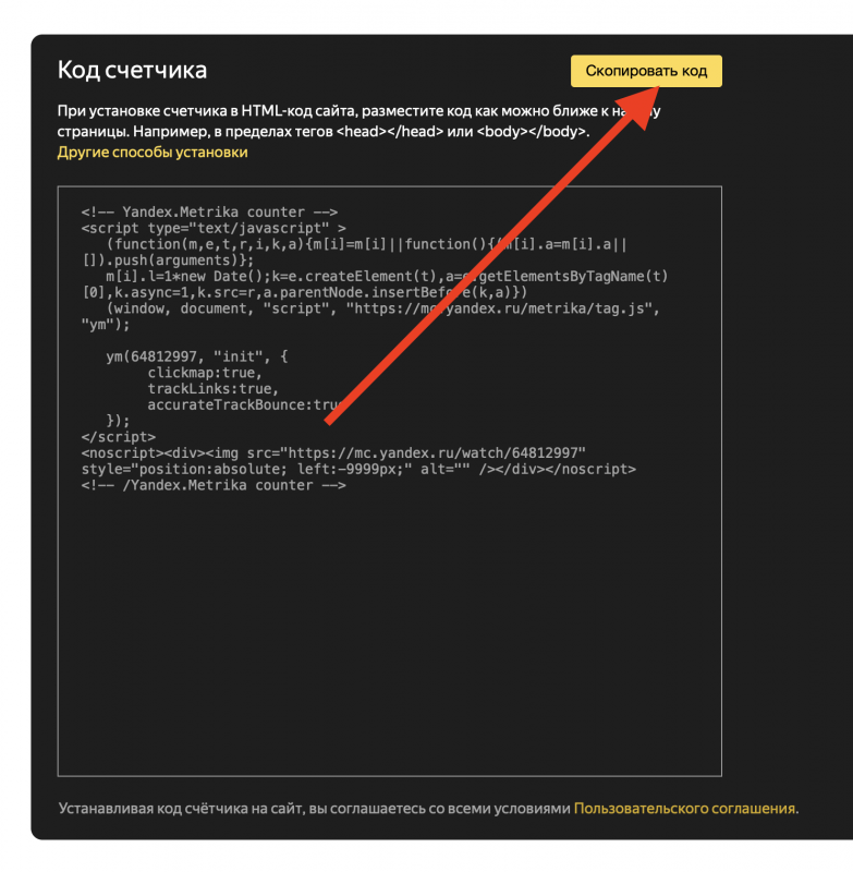 - В следующем окне внизу страницы будет черное поле с кнопкой "Скопировать код". Нажмите ее. А затем, ниже, нажмите кнопку "Начать пользоваться"