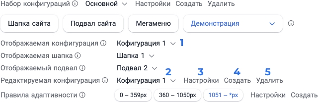Конфигурации — это объединение всех настроек конкретной страницы/шапки/подвала/мегаменю. В конфигурациях хранятся настройки правил адаптивности, секций, групп, подгрупп и виджетов, содержащихся в них.