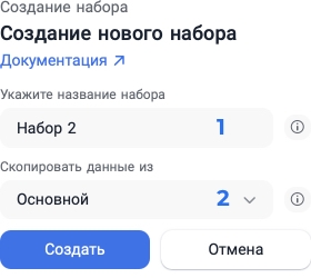 - При необходимости полностью скопировать данные из существующего набора, выберите его названия в списке «Скопировать данные из» #2 на рис. 4, или оставьте «Не выбрано», тогда вы получите пустой набор