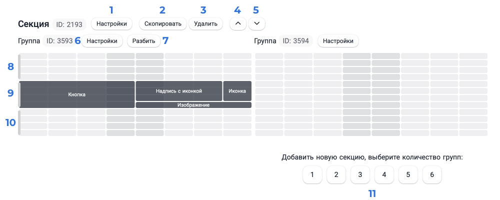 Создание секции: внизу самом низу страницы конструктора под надписью «Добавить новую секцию, выберите количество групп» нажмите на соответствующую кнопку. По умолчанию достаточно 1 группы в секции, но для исполнения более сложных дизайнов порой требуется использовать несколько групп в секции. После создания секции изменить количество групп в ней вы не сможете. #11 на рис.1