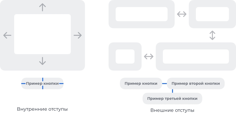 Для наглядности, отличия внешнего и внутреннего отступа приведем пример: отступы фона кнопки являются внутренними, а отступы кнопок друг относительно друга (или относительно вообще любых соседних элементов) — это внешние отступы.