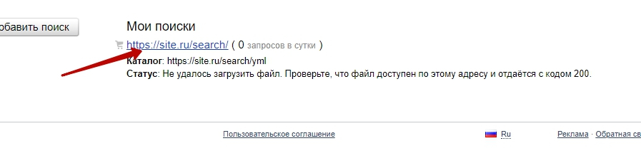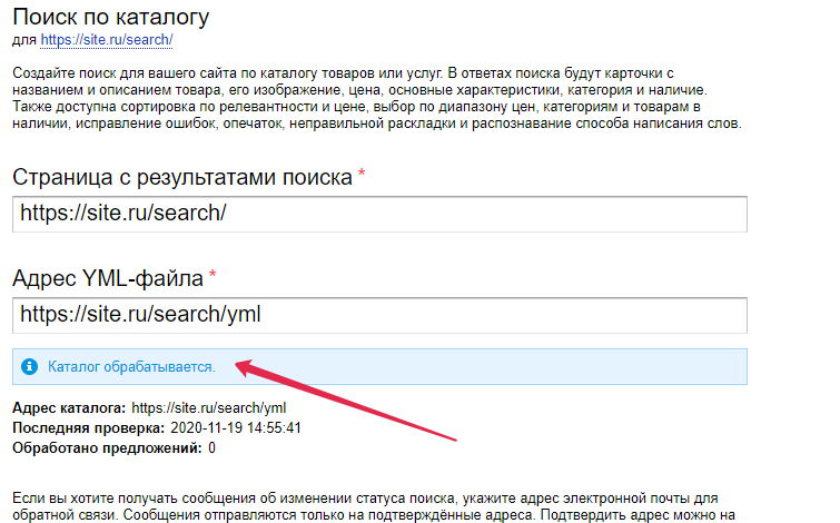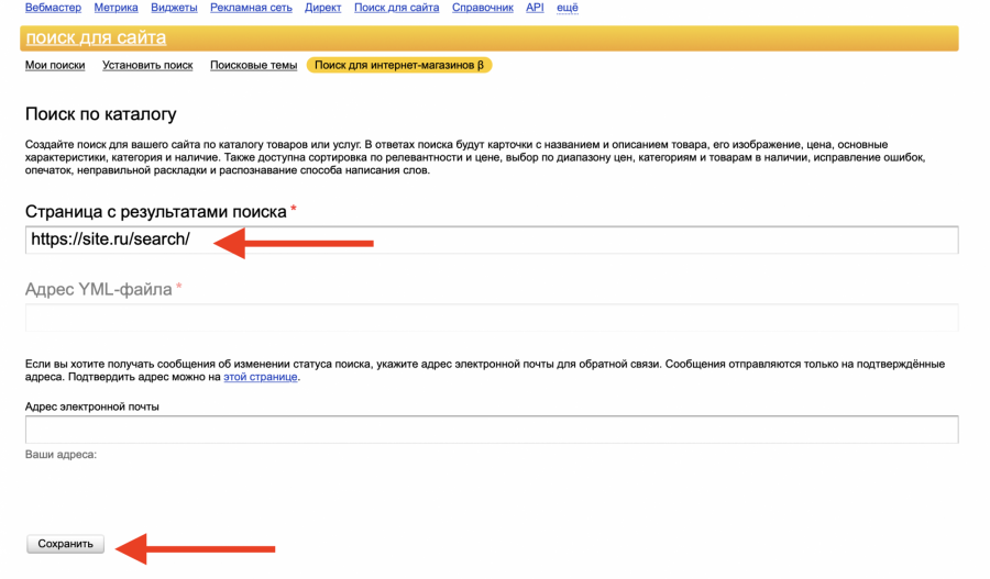 - Затем автоматически разблокируется поле "Адрес YML-файла", в него напишите адрес https://site.ru/search/yml, где https://site.ru – адрес вашего сайта. Снова нажмите "Сохранить"