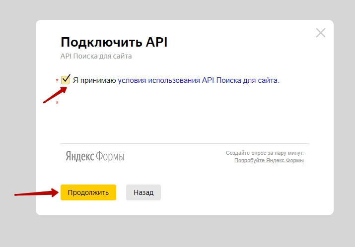 Примите "Условия использования API Поиска для сайта", нажмите "Продолжить" и затем "Перейти к API"