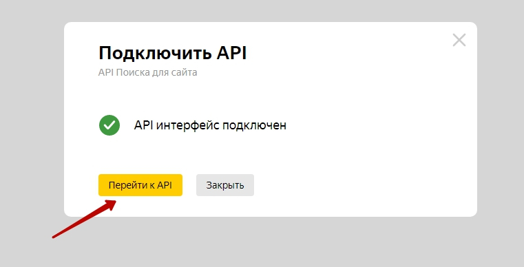 - Нажмите на кнопку "Подключить API", в открывшемся окне выберите "API Поиска для сайта", нажмите "Продолжить"
