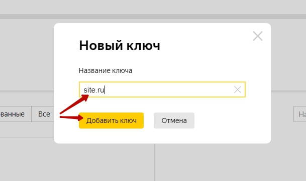 - В открывшемся окне введите название ключа (например, адрес вашего сайта), а затем "Добавить ключ"