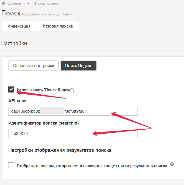- Перейдите во вкладку "Поиск Яндекс", поставьте галочку возле "Использовать Поиск Яндекс", после чего у вас появятся два поля. В поле "API-ключ" вставьте наш API-ключ, полученный на сайте Яндекс Поиска. (Как заполнить второе поле, описано в пункте 20)