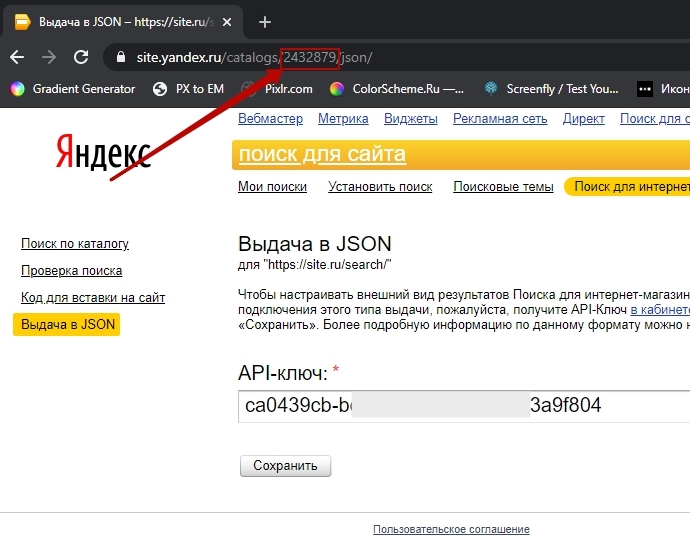 - Вернитесь о вкладку Яндекс Поиска, и в адресной строке браузера из адреса сайта скопируйте цифры. Например, из ссылке https://site.yandex.ru/catalogs/2432879/json/ нужны цифры "2432879". В админ-панели эти цифры вставьте в поле