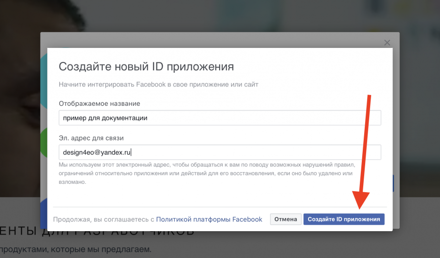 - Далее: напишите отображаемое название (оно будет отображаться, когда через ваш сайт будет авторизовываться пользователь) и адрес эл. почты. Нажмите «Создайте ID приложения»