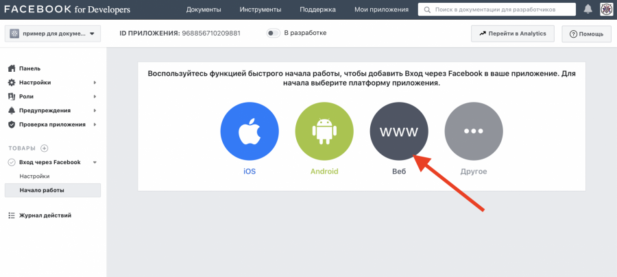 - В «Вход через Фейсбук» нажмите «настроить», а затем выберете «Веб»