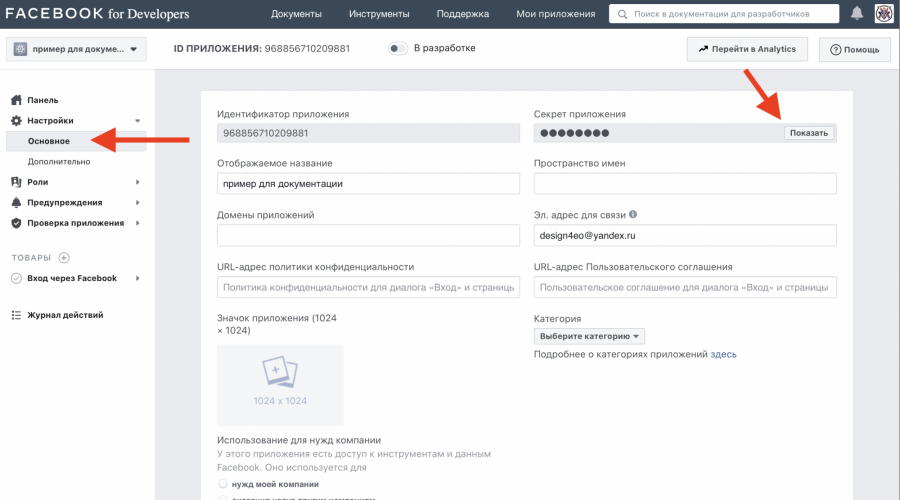 - Далее в левом меню перейдите в Настройки — Основное. Перед вам будет поле «идентификатор приложения» и поле «секрет приложения» нажмите «показать» и скопируйте оттуда ключ