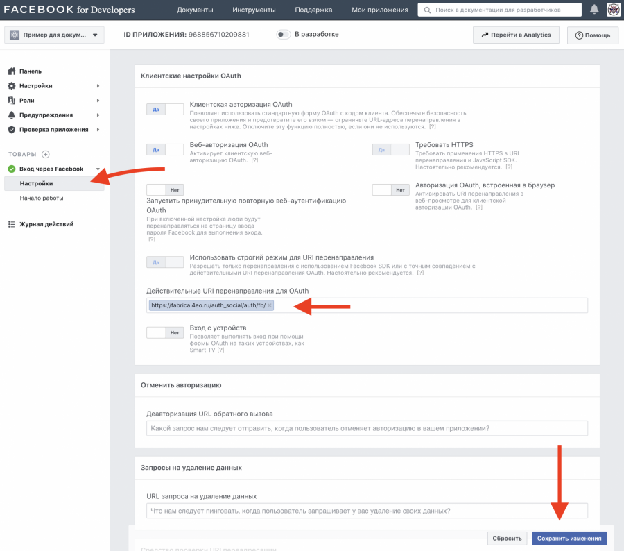 - В левом меню нажмите на «Вход через фейсбук», и в открывшемся меню нажмите «настройки», затем поле «Действительные URI перенаправления для OAuth» напишите следующее: скопируйте адрес (домен) вашего сайта, например «https://fabrica.4eo.ru», а затем в конец скопируйте и подставьте «/auth_social/auth/fb/», в итоге должно получиться: «https://fabrica.4eo.ru/auth_social/auth/fb/». Нажимаем «Сохранить изменения»