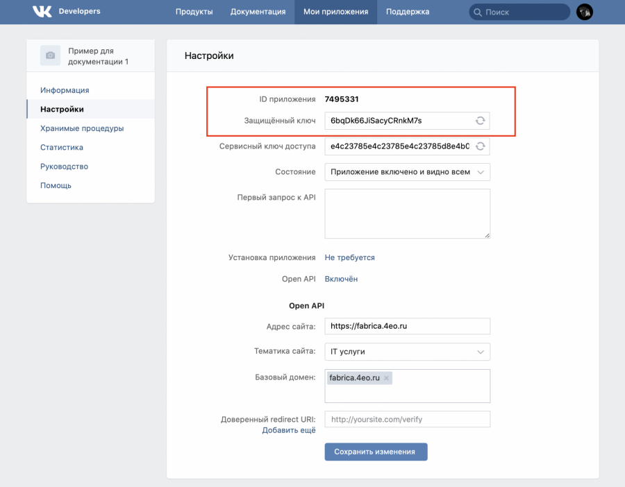 - У вас автоматически в двух верхних полях будут сгенерированы «ID приложения» и «Защищенный ключ»