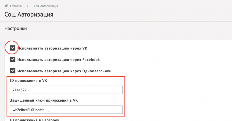 - Откройте админ-панель вашего сайта и в левом меню выберите «Соц. Авторизация», нажмите и в открывшейся странице в правом верхнем углу нажмите «Настройки модуля», поставьте галочку напротив «Использовать авторизацию через VK» и вставьте в «ID приложения в VK» и «Защищенный ключ приложения в VK» соотвествующие значения из ВКонтакте