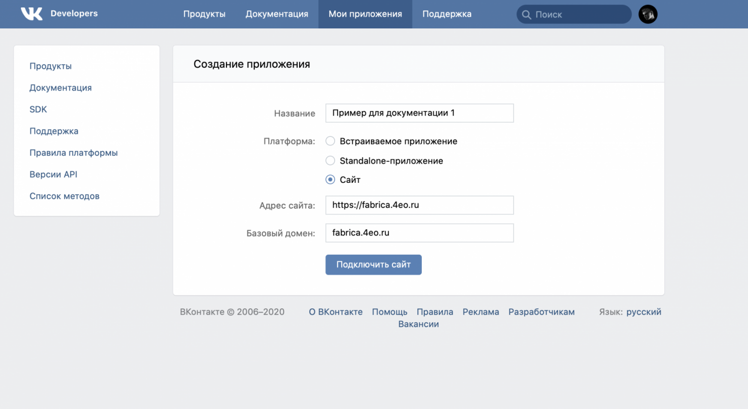 - Пишем название приложения (оно будет отображаться, когда человек будет входить через ВКонтакте на ваш сайт), выбираем «Сайт», пишем домен сайта и чистый домен (к примеру, в первую строку пишем https://fabrica.4eo.ru, а во вторую — fabrica.4eo.ru). Нажимаем «Подключить сайт»