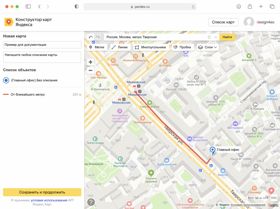 - Напишите данные своей карты (название и описание в шаблоне не отображается), расставьте необходимые метки (для удобства поиска адреса, вбейте его в поле поиске вверху сайта)
