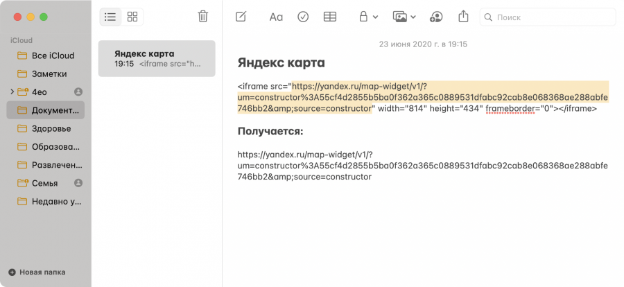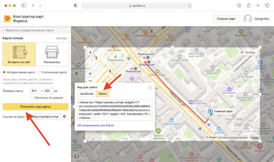 - Нажмите кнопку "Получить код карты" и выберите вкладку "iframe"