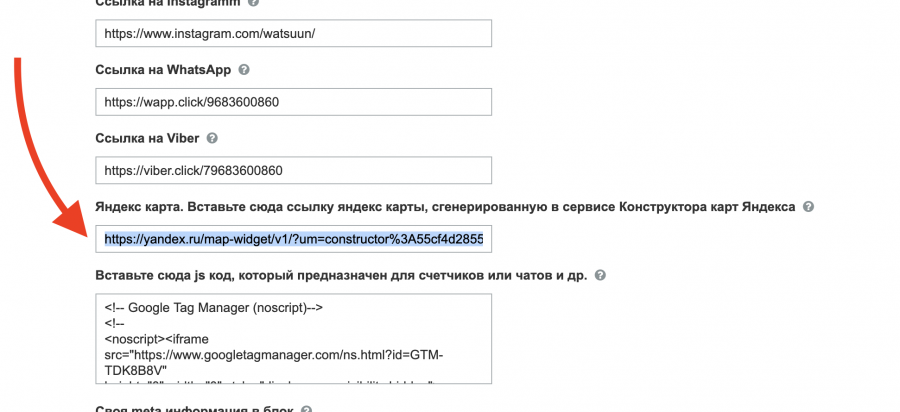 - Скопируйте полученную ссылку, затем перейдите в настройки шаблона в раздел Информация и пролистайте до поля "Яндекс карта"